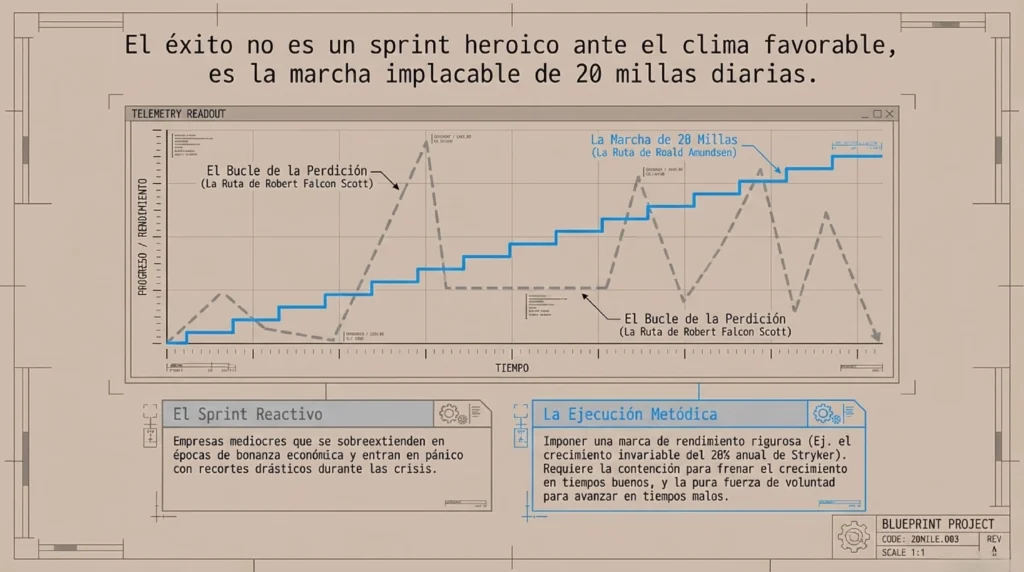 Collins ilustra la disciplina fanática con la parábola de dos expediciones que intentaron llegar al Polo Sur en 1911 casi simultáneamente: la de Roald Amundsen y la de Robert Falcon Scott. Amundsen planificó avanzar exactamente 20 millas al día, todos los días, independientemente del clima. Los días buenos, cuando hubiera podido avanzar 30, se detenía en 20. Los días malos, con ventisca o frío extremo, encontraba la manera de avanzar sus 20 millas. Scott no tenía ese protocolo: avanzaba mucho en los días buenos y se detenía en los malos. Amundsen llegó al Polo Sur el 14 de diciembre de 1911. Scott llegó 34 días después y murió en el camino de regreso. La diferencia no fue el heroísmo, la valentía ni la visión: fue la disciplina fanática de las 20 millas diarias.