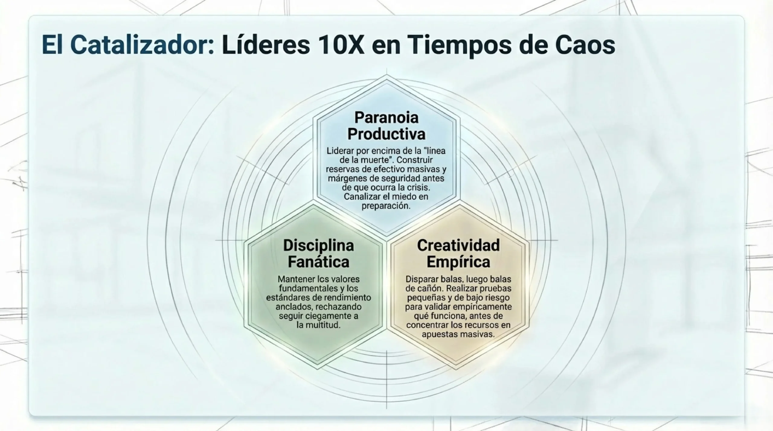 Andy Grove, el legendario CEO de Intel, acuñó la frase «solo los paranoides sobreviven». Collins y Hansen documentan cómo los líderes 10X convierten esa paranoia en un sistema de gestión. Paranoia productiva significa vivir con una conciencia permanente de los riesgos potenciales —del entorno, de los competidores, de la propia organización— y construir reservas y planes de contingencia antes de necesitarlos. No como respuesta al miedo, sino como expresión de disciplina.