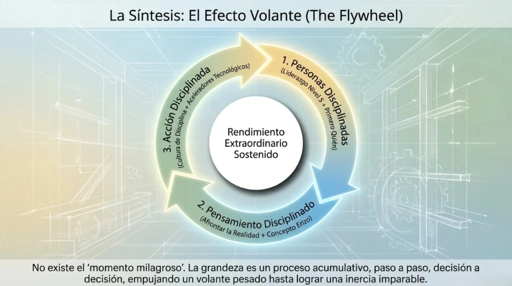 Uno de los hallazgos más importantes —y menos intuitivos— de Good to Great es que ninguna de las 11 empresas identificó un momento de ruptura, una decisión única o un programa de transformación que explicara su salto a la grandeza. Cuando Collins y su equipo entrevistaron a sus líderes, ninguno describía un «punto de inflexión» dramático. Lo que describían era una acumulación sostenida de pequeñas acciones consistentes que, sumadas en el tiempo, generaban impulso exponencial. Collins lo llama el efecto volante: imagina una rueda enorme y pesada que requiere un esfuerzo enorme para dar el primer giro, luego el segundo, luego el tercero. Cada giro cuesta trabajo. Pero con el tiempo, el impulso acumulado hace que la rueda gire sola.