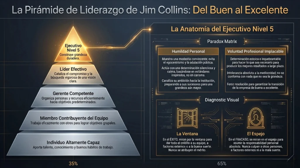 El hallazgo más contraintuitivo de Good to Great es que los líderes que protagonizaron las mayores transformaciones empresariales no son los carismáticos, los visionarios mediáticos ni los estrategas brillantes que uno esperaría encontrar. Son lo que Collins llama líderes de Nivel 5: ejecutivos de voluntad de hierro pero con humildad personal genuina. Su ego no está puesto en ellos mismos, sino en la institución que construyen. Cuando las cosas van bien, miran por la ventana y atribuyen el mérito a su equipo, al contexto, a la suerte. Cuando las cosas van mal, miran al espejo y asumen la responsabilidad personal.