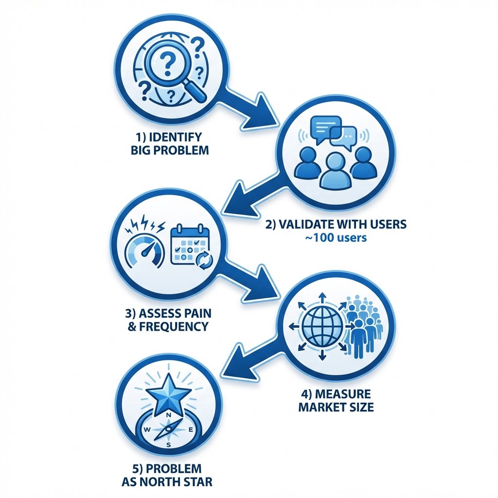 - Filtra con criterio «Big Problem»: ¿Es doloroso (7+/10)? ¿Es frecuente (semanal+)? ¿Afecta a millones? Descarta problemas que no cumplen los 3.