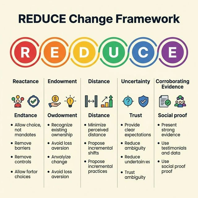 El marco REDUCE de Berger explica que estas barreras actúan como frenos invisibles. Da igual lo bueno que sea el proyecto: si esos frenos siguen activos, el cambio no ocurre.