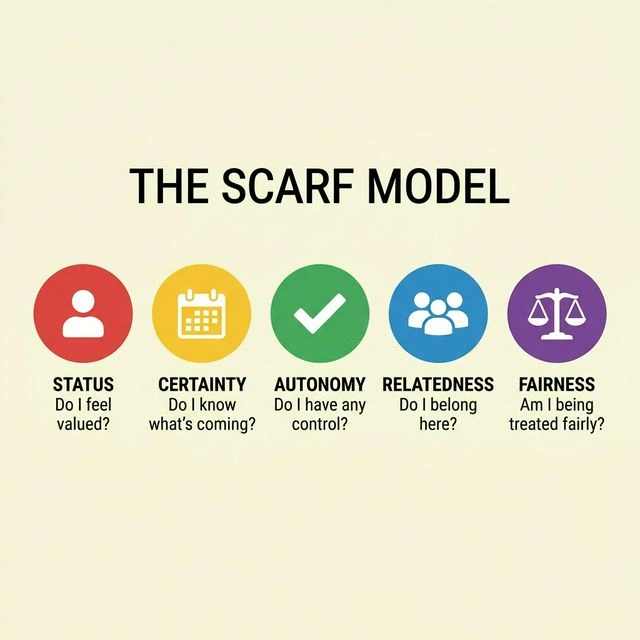 • Relatedness (Relaciones Sociales): Necesidad de pertenecer y confiar en los demás. Cuando percibimos a otros como aliados, colaboramos más; si los percibimos como amenaza, nos cerramos. Por ejemplo, compartir casos reales de equipos internos que ya están aplicando un cambio genera confianza y facilita que otros lo adopten.