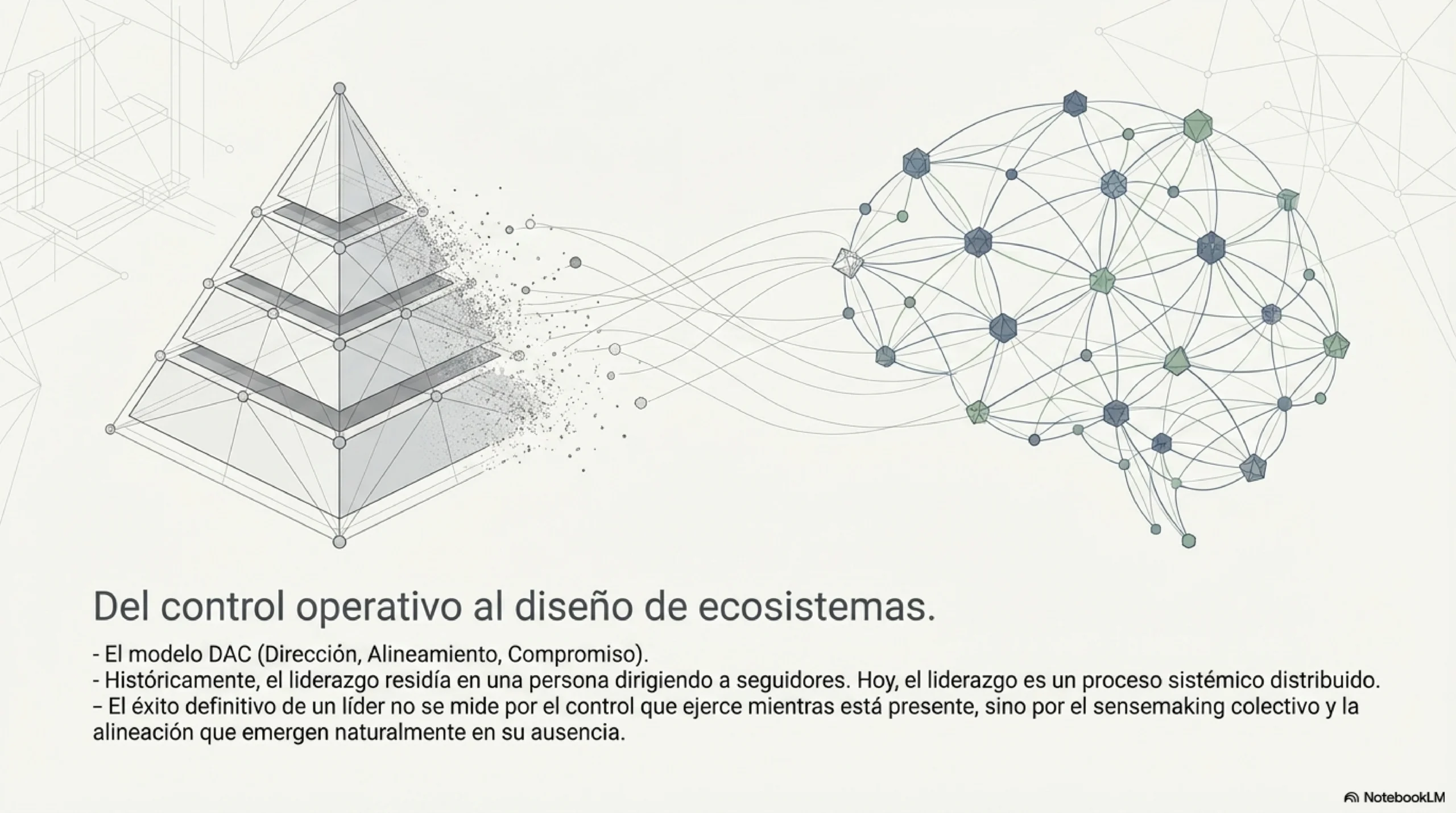Riesgo principal: La descentralización mal ejecutada se convierte en caos. Si no hay claridad en los objetivos, la autonomía distribuida lleva a decisiones contradictorias. También puede ralentizar el sistema (por exceso de análisis colectivo) o generar la paradoja de un líder que, al intentar no centralizar, se convierte en el cuello de botella de las conversaciones de alineamiento.